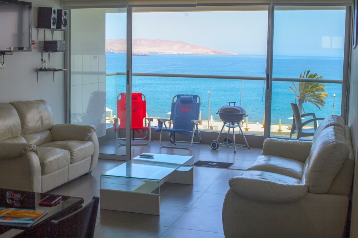 Minidepartamento con terraza frente al mar, primera fila (exactamente en la carretera de Pisco/Paracas) Cochera dentro de la propiedad incluida. -10 minutos de Paracas. -5 minutos al centro de Pisco. Cuenta con 2 habitaciones (cada una con cama matrimonial) Cuenta con cocina,menaje hervidor eléctrico, microondas, frigobar, parrilla y utensilios.