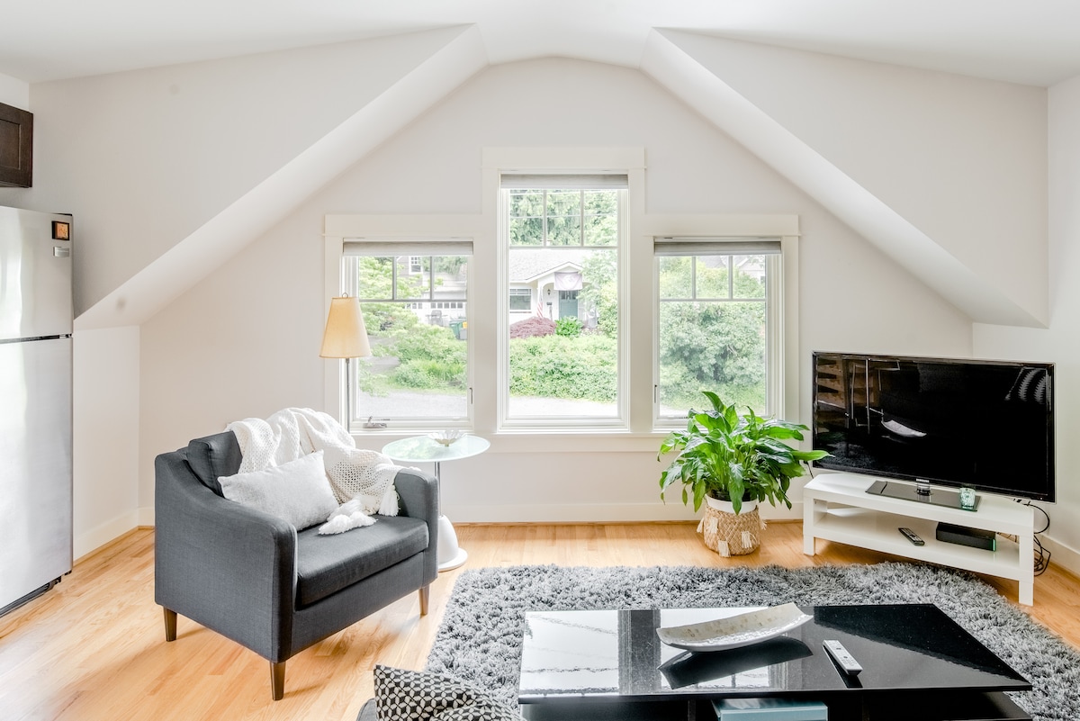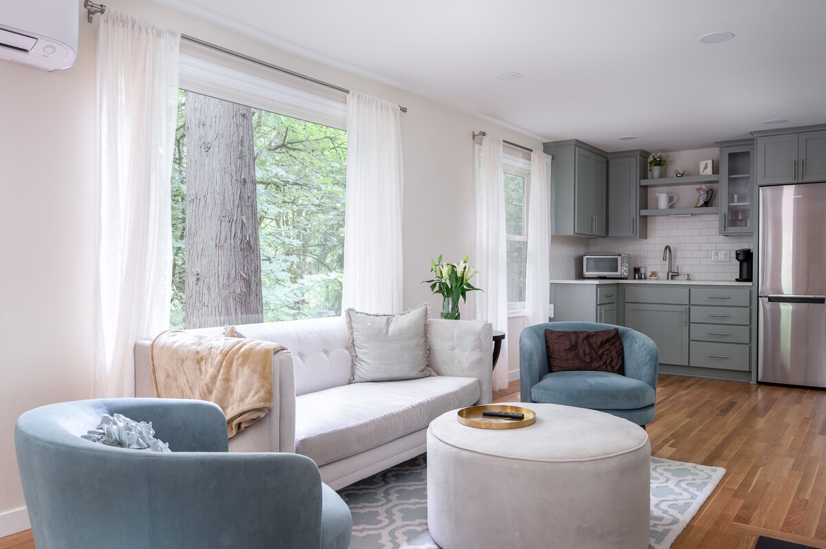 Cerca de la ciudad... pero no demasiado cerca. Relájate en la comodidad de un apartamento con «ventanas traseras» totalmente renovado, con vistas a imponentes cedros y abetos de Douglas. Observación de aves, senderismo urbano y fácil acceso en todas las direcciones. Cerca del mirador más alto de Portland. Relájate y desconecta en este alojamiento tranquilo y elegante. Durante los meses más fríos, disfruta de la chimenea de gas con control remoto mientras lees o ves tus programas favoritos en la sala de estar.