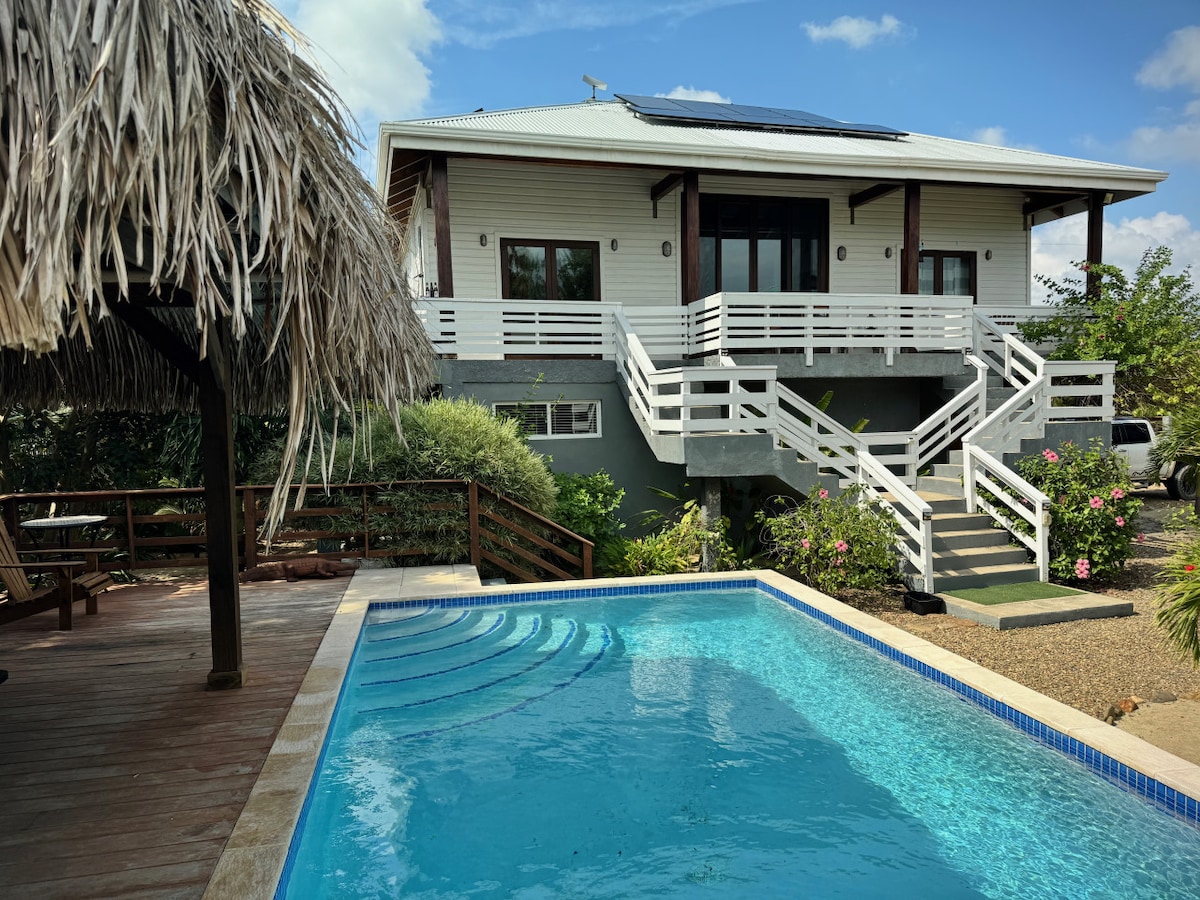 ¡TARIFAS mensuales de temporada BAJA! Totalmente abastecido. ¡Reseñas Rave! ¡Esta casa de playa de estilo encantador está orientada a una pareja romántica y llena de características adicionales! Respaldo solar. Diseñado con techos altos, maderas exóticas, obras de arte, paquete de iluminación de alta gama y muebles artesanales locales. Una sensación de cabaña de playa, frente al OCÉANO/LAGUNA en su propio canal con magníficas puestas de sol, aves, mariposas. Grandes puertas correderas que nunca bloquean 180 vistas del océano Caribe y la laguna, saltando rayas. Las brisas DISFRUTAN