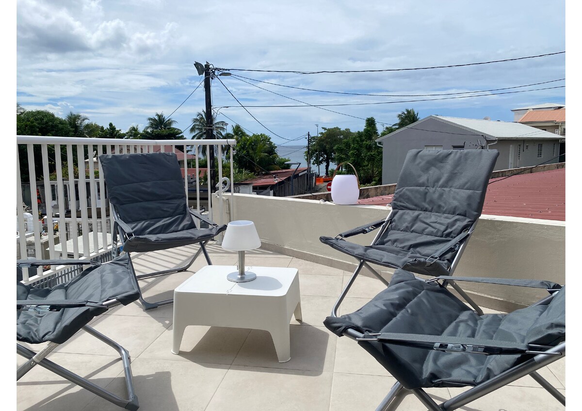 Turtle Bay Locations Grande Anse - Martinique Mini Villa T1 en hauteur offrant une vue panoramique sur la mer et la campagne. Accès mer à 50m à pieds. Plage connue pour ses nombreuses tortues vertes visibles en palme masque tubas toute l’année. Composée d’une chambre climatisée avec moustiquaire, une salle de douche avec WC, une cuisine équipée sur la terrasse couverte et une piscine privée de 2m*3m sur la terrasse découverte. Restaurant TiSable à 50m et petits commerces à 500m.