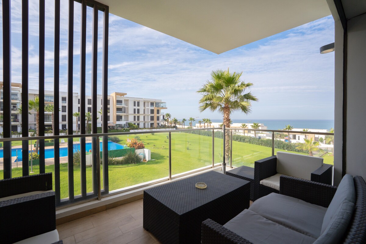 muy bonito apartamento en planta baja con una fachada con vistas al mar y otra fachada con vistas a la piscina y jardines. situado en un complejo residencial cerrado y seguro con plaza de aparcamiento indoor y al aire libre. tranquilo y silencioso. dos dormitorios con armarios empotrados y un gran salón con vistas al mar. terrazas agradables y jardines cuidados . la playa está etiquetada a 20 minutos de Rabat, ciudad turística, agradable donde se pueden admirar varios monumentos históricos como el Chellah, oudaya, tour Hassan, oued Bouregreg..