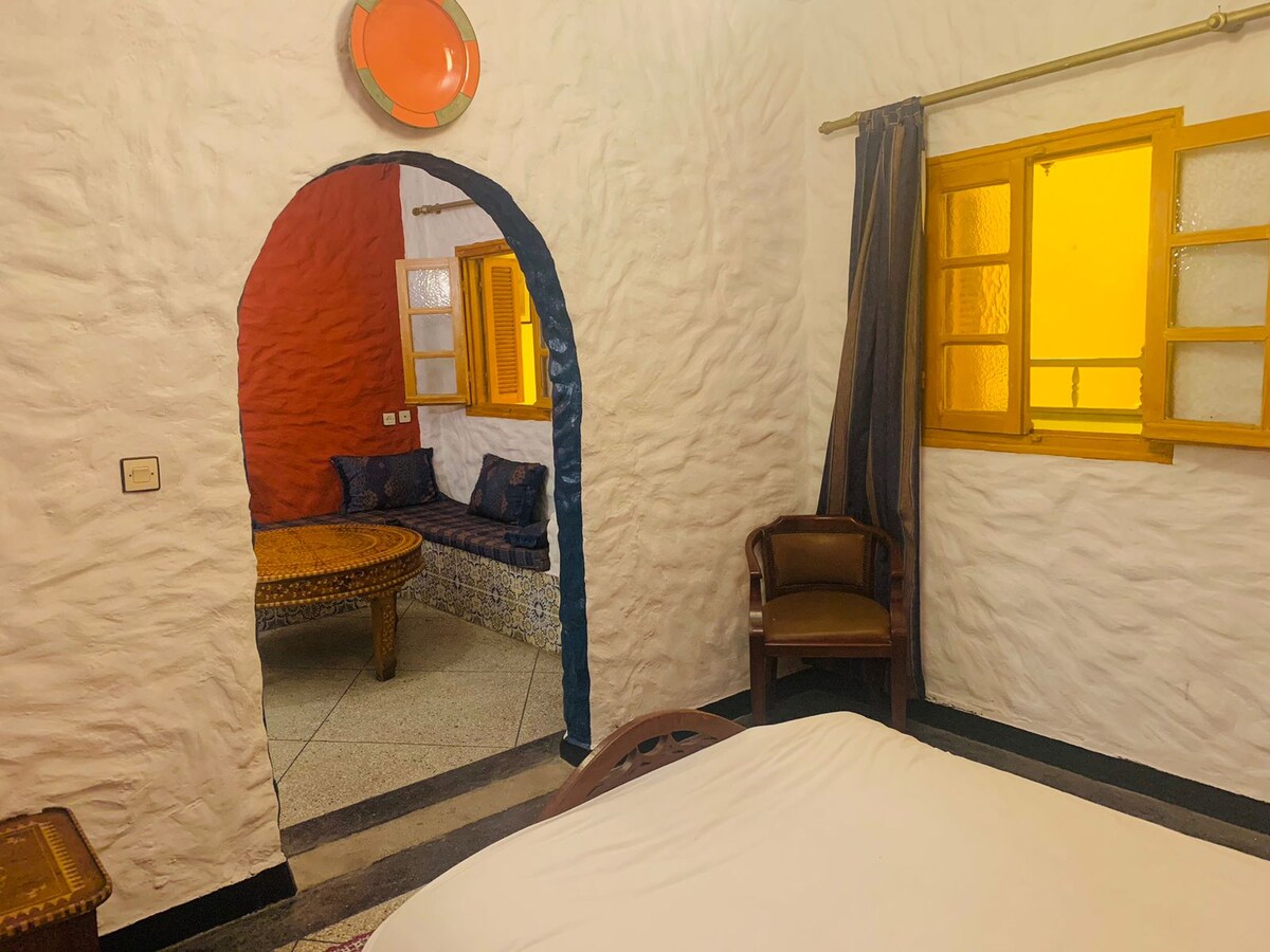 Elegante y espaciosa, esta habitación privada cuenta con una lujosa cama tamaño king, toques tradicionales marroquíes y comodidad moderna. Perfecto para parejas o viajeros solitarios, ofrece privacidad, elegancia y fácil acceso a la vibrante medina y playas de Esauira. Relájate en un ambiente sereno, disfruta del diseño local y relájate cómodamente