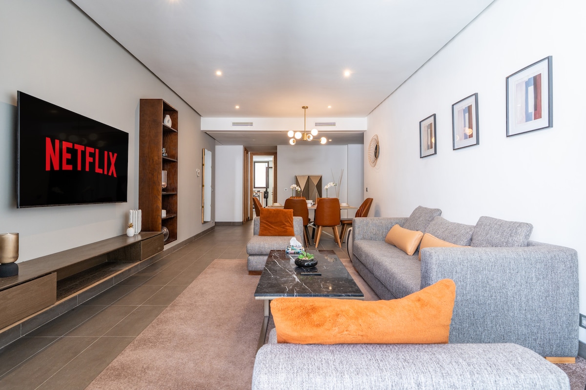 Apartamento de lujo de 2 dormitorios en el prestigioso complejo Anfaplace, a solo 20 metros de la playa. Amueblado con buen gusto por un arquitecto, ofrece dos suites con baño (bañeras), Smart TV, fibra óptica, gran cocina moderna y elegante salón. Terraza soleada, jardín exterior, aparcamiento subterráneo seguro. Acceso directo al Anfaplace Mall, restaurantes y paseo marítimo. Ideal para una estancia refinada entre lujo, comodidad y vistas al océano en Casablanca