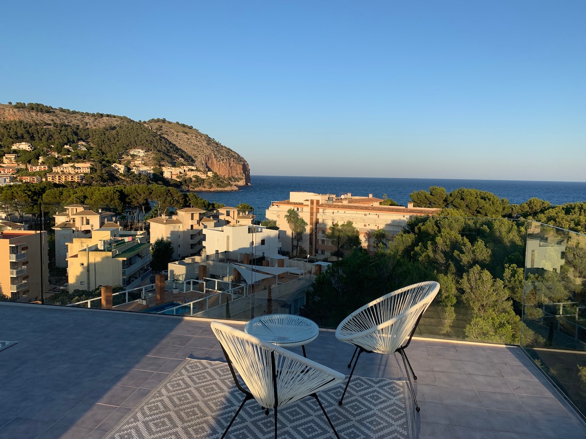 5-minute walk from the cosy beach of Canyamel, BRAND NEW one-bedroom apartment with a 15m2 terrace overlooking the sea, the village, and the hills and forests of Canyamel Bright living room and bedroom, fully equipped kitchen (dishwasher, washing machine, Nespresso etc.), full bathroom With air conditioning and heating PERFECT FOR TELEWORKING! WIFI: 800MB fiber Private property with swimming pool, gardens, a breath-taking rooftop terrace with sunbaths and sofas (7th floor) and private parking