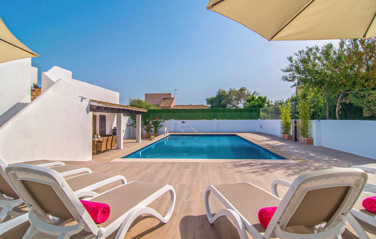 Casa de vacaciones cerca de la playa de arena blanca para 8 personas, 4 habitaciones dobles, 2 baños totalmente equipados, piscina vallada y jardín con barbacoa.<br><br>Ubicada entre el Puerto de Alcúdia y Platja de Muro, se encuentra a una a menos de 50 metros de la orilla de la playa de arena blanca. <br><br>La propiedad cuenta con una terraza delantera y un jardín con piscina privada de 3,5m x 5m de largo donde refrescarse en la parte trasera.