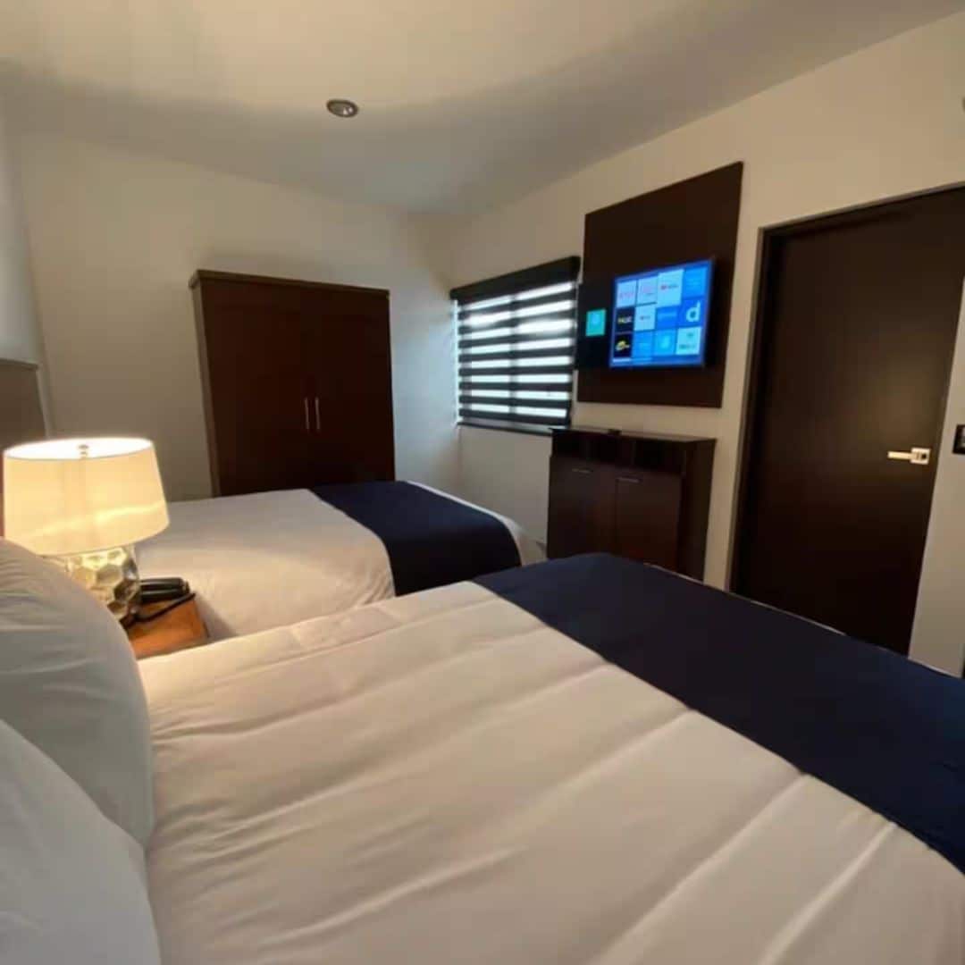 Habitacion para 4 personas con alberca consta de dos camas matrimoniales, contamos con alberca y pantalla gigante en Area de alberca, a dos calles de playa y 7 minutos de del malecón, son varios colores por eso se adjuntan diferentes imágenes