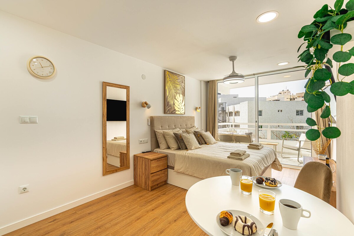 Experience the comfort in our Mint Studio (open plan layout), located in the popular Castle Harbour complex in Los Cristianos. ★„The apartment is just like the photos, very clean and tastefully decorated.“ 🌞 Why You’ll Love Our Studio: ✅ King Bed – Sleep in comfort ✅ Sunny terrace – Chill in the sun all day ✅ 50-inch Flat TV – Relax with your shows ✅ Ceiling Fan – Comfort on warm days ✅ Heated Pool – All year round ✅ Parking - Free in complex or nearby street ✅ Cook Zone – Compact kitchen