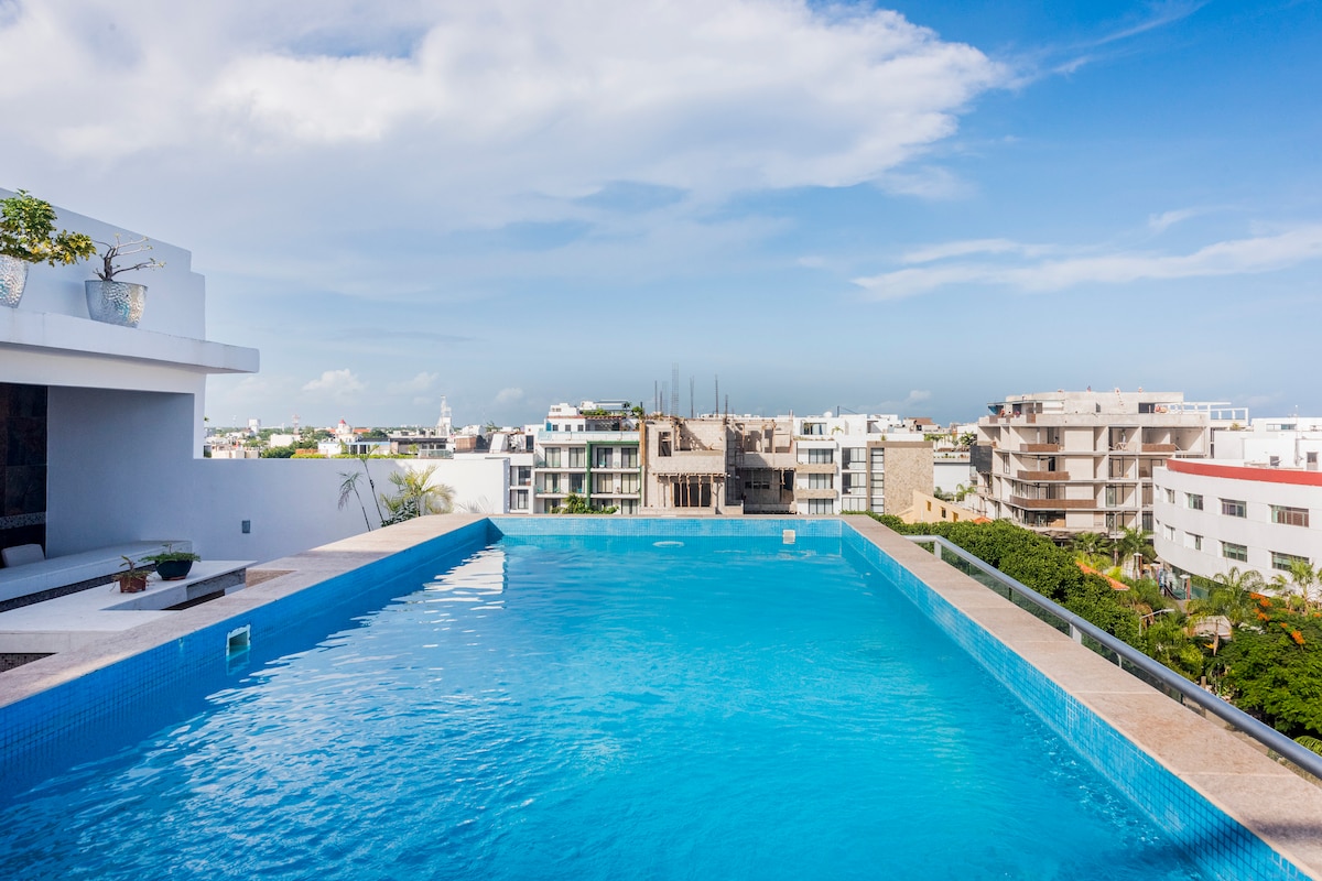 Hermoso departamento con alberca o piscina para tener un lugar de descanso cómodo y está abierta hasta las 10 pm, elevador, vigilancia, cámaras seguridad en el estacionamiento, contamos con (Wifi de alta velocidad de 60 mbps) para las personas que trabajan desde casa, Colchón nuevo, una cama queen y un sofá cama individual, sartén nuevo, Apartamento tipo Loft a 8 min en carro de la quinta avenida, silencioso, cocina de granito, aire acondicionado, balcón y 🏊♀️alberca