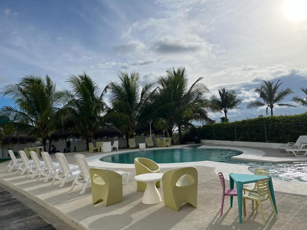Relájate con toda la familia en este tranquilo lugar para quedarse. Un apartamento a orilla de la playa, ubicado en el segundo piso, con elevador, edificio de 7 pisos. Apartamento con 2 cuartos, con aire acondicionado, un cuarto con cama doble, el otro cuarto con 2 camas individuales y un sofá cama, el apartamento está Cerca de un rancho de comida de marisco. Restaurante Las Olas. A 10 minutos Supermercados y más.Te esperamos