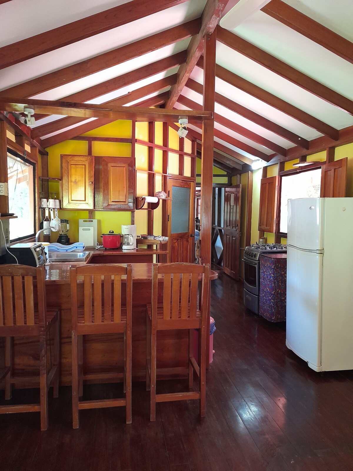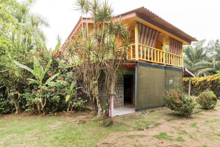 Charming beachfront cabina in a peaceful and secure location that is in a central location close to restaurants, bars and market. Large garden including access to a rancho with barbeque grill and hammocks. Cabina linda y grande en lugar muy tranquilo y seguro. Frente a la playa con jardín amplio, cuenta con área de parrilla, un rancho, hamacas, árboles de coco, en lugar céntrico, con carretera cercana, acceso fácil a restaurantes, supermercados, y bares.