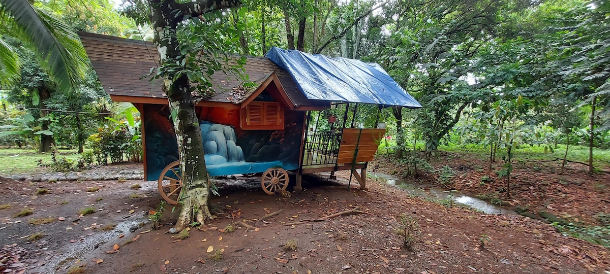 This Gypsy Wagon style Tiny Home is one of our most affordable cabins. If you don't mind sharing a bathroom and having a fan room, it's the perfect little spot. Just steps from the beach, this cabin has 2 beds with a private deck and hammock and mini-kitchen. Get a massage at our spa or take a yoga or pilates class at our Yoga Deck. We also host weekly social events like Open Mic Night, Taco Night and Ecstatic Dance every other week. You won't want to leave this private, jungle paradise.