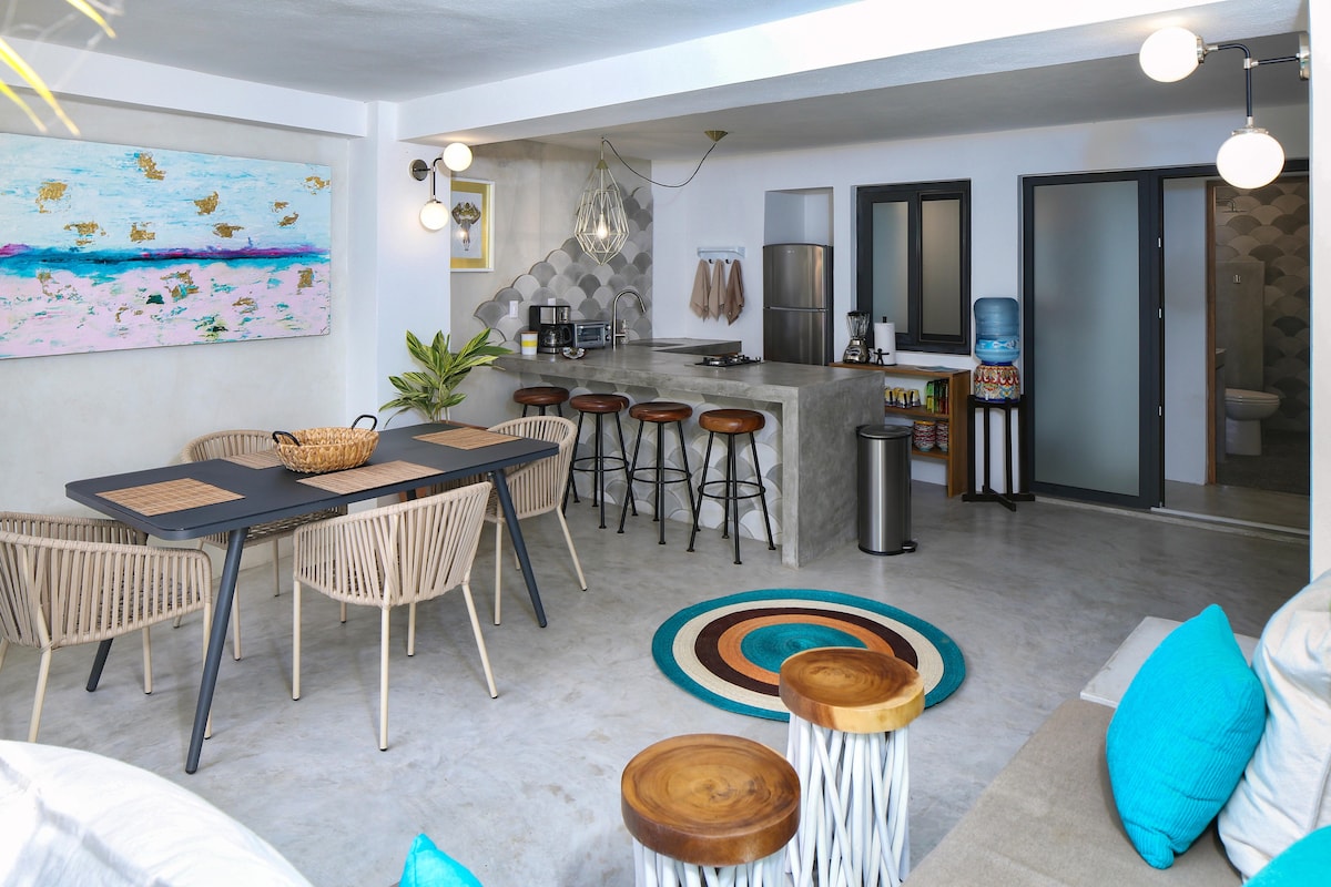 Great speed WiFi reliable for working remotely, Cozy apartment in Sayulita downtown just 2 blocks away from the beach. 2 bedroom and 2 sofa beds, capacity 6 pax total. Garden area and large room with high ceilings giving a balance of luxury and comfort, for relaxation and tranquility. You can enjoy coffe shop, bars and restaurants to delight your palate just a few steps away, it includes air conditioning, automatic controlled access, parking space, incredible lounge pool.