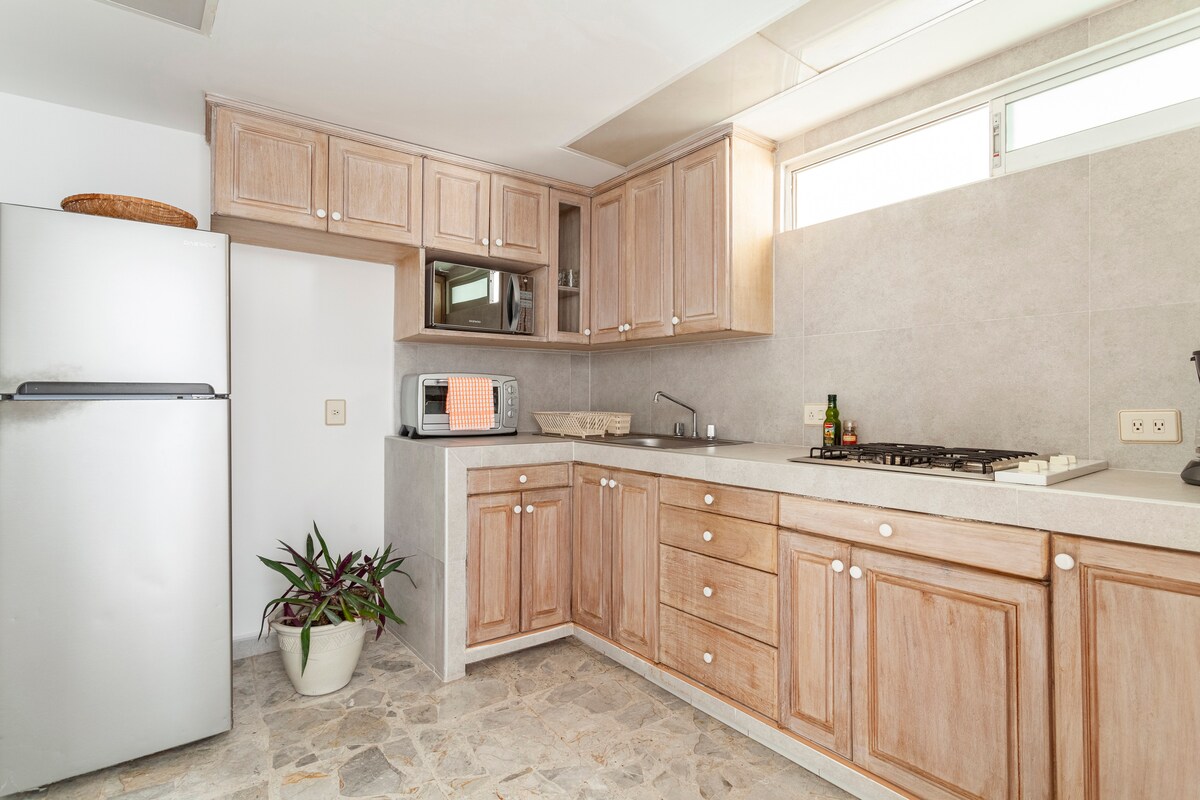 Comodísimo departamento duplex totalmente equipado con aire acondicionado (opcional ventiladores de techo) primer piso. Dos recámaras, cuatro camas individuales y estudio con sofá cama matrimonial. Con pantalla de TV en cada recámara. Dos baños completos con agua caliente 24 hrs. Cocina equipada, refrigedor, estufa eléctrica, cafetera, licuadora, vajilla, vasos, tazas y utensilios suficientes para cocinar. Alberca planta baja y elevador Seguridad las 24 horas.