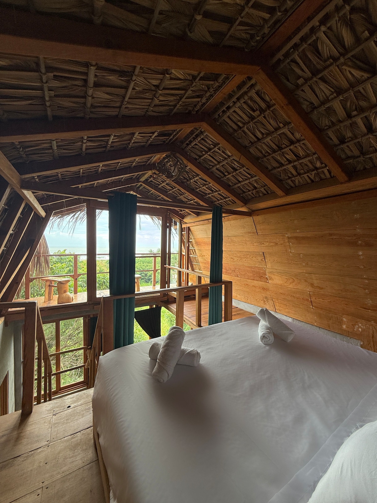 Ubicado en la Punta de Zicatela, a unos minutos caminando de la playa, restaurantes y demás atracciones de la zona. Con excelente internet de fibra óptica y Starlink. Tiene una terraza privada en el segundo nivel, con una hermosa vista, mesa y sillas. Cama queen size, AC, ventilador, cocineta con frigo, cafetera, tetera, filtro de agua. Baño completo y un pequeño clóset. Tiene un balcón con una pequeña mesa y dos sillas, con persianas de madera que al abrirse tienen vista hacia el jardín.