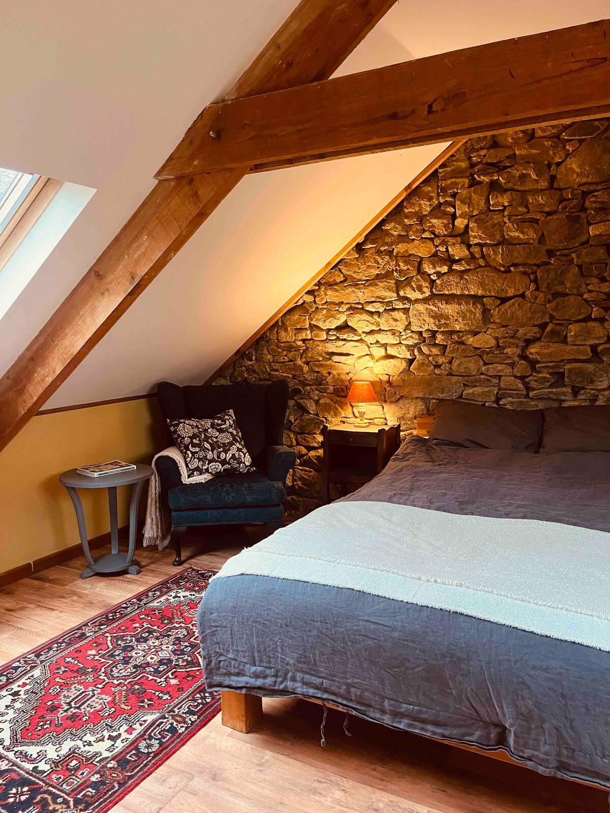 Buscas un alojamiento diferente a los demás. Al renovarlo, queríamos muebles que no encontrará en casa de todo el mundo, muebles de madera, que tengan encanto, una historia, la mayoría de las veces fabricados en Francia. Este concepto aporta serenidad, calma y confort. La renovación también se elige en armonía respetando la ecología: las paredes de cáñamo/cal, el aislamiento de paja, los tabiques de madera, las losas de pizarra en el baño y el inodoro.