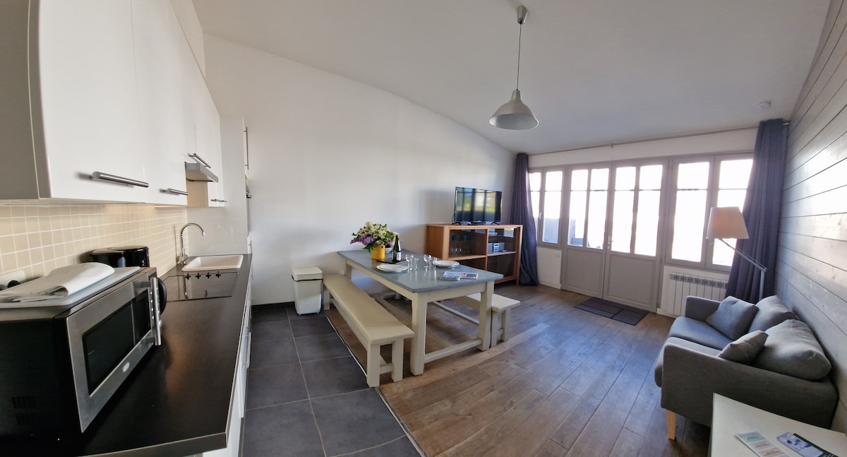 Apartamento: En total hay dos camas: - uno en el dormitorio - uno en el altillo por encima de la cocina. Cocina equipada con baño dormitorio para dos personas. Sofá en el dormitorio para disfrutar de las vistas al mar, no se hace para dormir Terraza orientada al sur y jardín privado en el lado sur Terraza junto al mar con gran jardín compartido ¡La playa o el puerto de Diben están a 5 minutos andando!