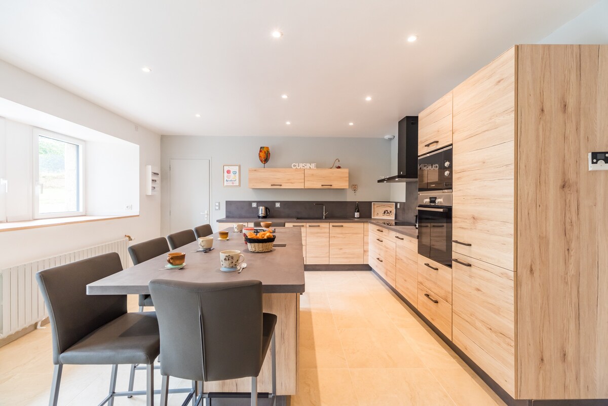 Casa de 1800 cuya renovación se completó en abril de 2020. Está idealmente situada a 500 m de un pueblo dinámico que ofrece muchas tiendas y servicios (panaderías, supermercado, pescadería, embutidos, médicos, dentista, farmacia...). Se encuentra a 3 km del mar y de la playa (accesible por una vía verde), en un entorno tranquilo. Numerosas actividades (deportivas, culturales, históricas) son posibles en la Costa de Granito Rosa: trail, kayak, surf, senderismo...