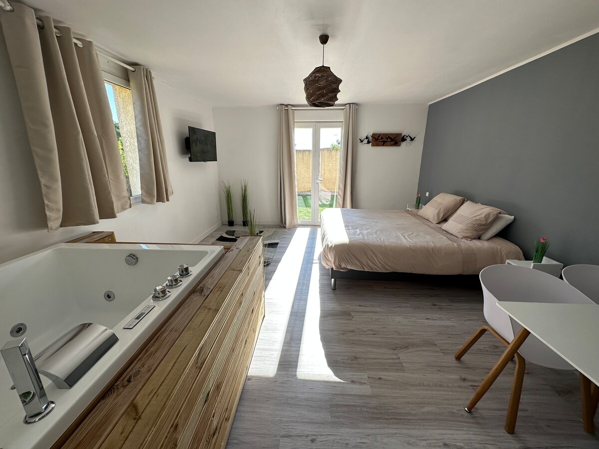Nuestro alojamiento de 30 m2 ofrece una sala de estar equipada con una bañera de hidromasaje premium, 22 chorros de hidromasaje y una cama KING SIZE. Jardín privado sin vecinos equipado con mesa y sombrilla. Entrada independiente a través de código digital. Cocina independiente con microondas, nevera, cafetera senseo, vitrocerámica... Televisor de pantalla plana con wifi Cuarto de baño con placa de ducha Aseo separado Aparcamiento seguro en terreno cerrado Tranquilidad, relax, sol...