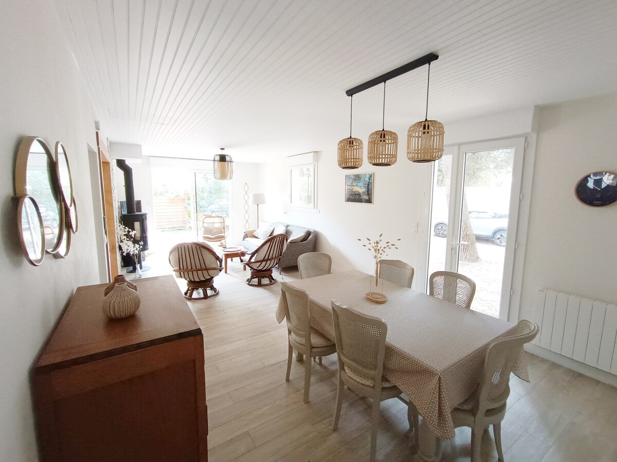 Casa de estructura de madera reciente, 60 m2, decorada con buen gusto, clasificada con 3 estrellas por la Oficina de Turismo de Vendée Sala de estar de 40 m2 orientada al sur con cocina americana. Habitación 1 de 11 m2 con cama de 160. Habitación 2 con cama de 80. Cuarto de baño con ducha italiana. Wifi. TV. Lavadora. Lavavajillas. Terraza cubierta con preciosas vistas al bosque. Centro de la ciudad a 5 minutos, playa a 10 minutos a pie. Tranquilo.