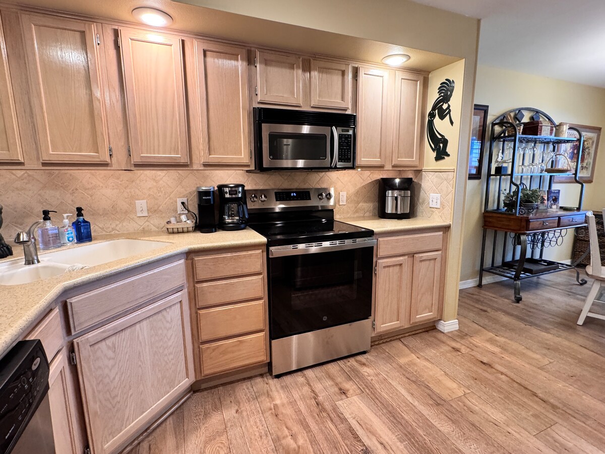 En este alojamiento se respira tranquilidad: ¡relájate con toda la familia! Remodelación reciente, TV grande, cable, wifi. Hermosa vista del 16th Fairway. El apartamento privado incluye una cama tamaño king, una litera doble con una cama tamaño queen y un sofá cama tamaño queen. Electrodomésticos nuevos. Ducha en el baño principal con cabezal tipo lluvia para el final perfecto de tu divertido día. Disfruta de una taza de café por la mañana o de una copa de vino por la noche mientras observas los patos y gansos en el patio trasero. Los relajantes sonidos del arroyo eliminarán tu estrés.