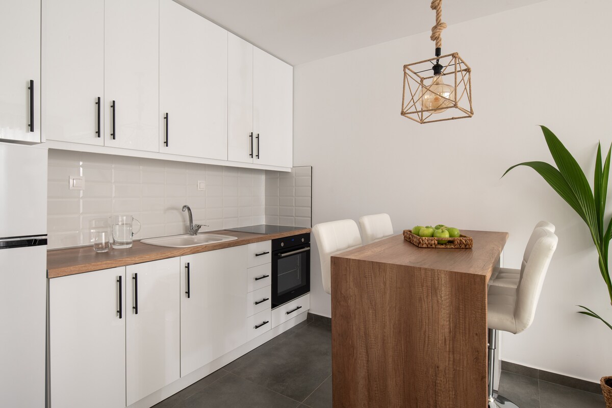 Tómese un descanso y relájese en nuestro apartamento renovado, situado en la tranquila zona de Polichni, muy cerca de los hospitales G.N.TH. Papageorgiou y G.N.S.E. 424. Tiene acceso directo a la carretera de circunvalación de Tesalónica y a las paradas de autobús de la OASTH. Cerca del mercado local de Polichni y a 10 minutos del centro de Tesalónica. Nuestro apartamento en la planta baja es un espacio cómodo que cuenta con las comodidades que le harán sentirse como en casa.