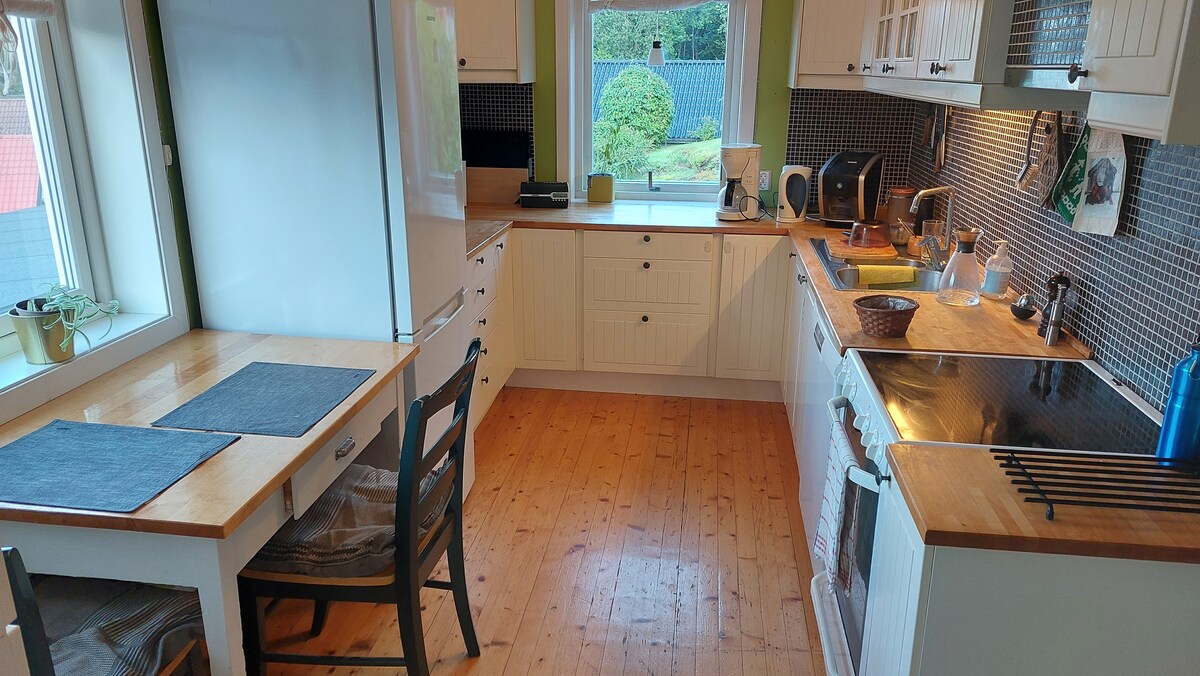 Espacio tranquilo y silencioso con bonitas vistas y buenas condiciones de sol desde la mañana hasta la noche. La casa está al final, por lo que no tiene tráfico. Døvika se encuentra al final de Eidangerfjorden. Aquí realmente puedes relajarte para disfrutar del sol y de la vista. Hay grandes pisos/porche con muebles de jardín. Es una sala de jardín amueblada Acceso compartido a la playa privada a 2-3 minutos caminando. Espero que disfruten tanto como nosotros en este maravilloso lugar. La casa es céntrica y está bien equipada. Estacionamiento gratuito en el alojamiento.