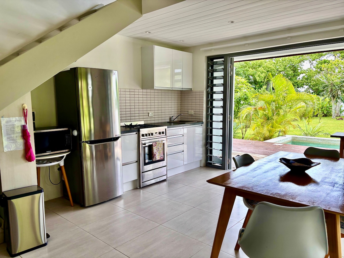 Private Loft Villa with Plunge Pool Peaceful loft-style tropical villa with a private plunge pool in Angelfish Cove, just 20 minutes from Port Vila. Surrounded by lush gardens and steps from a white sand beach, it’s perfect for a relaxing island escape. The loft bedroom sleeps up to 3 guests, with an optional second bedroom with private entrance and separate bathroom, allowing the villa to host up to 5 guests. Perfect for couples, friends, or small groups.