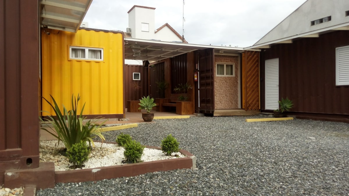 Rodéate de estilo en esta acogedora suite a 350 m de la playa. Suite PRIVADA con acceso independiente en una casa construida con contenedores de marítimos reciclados. *Mascotas: No permitidas en esta unidad. Si necesitas traer a tu mascota, consulta nuestras unidades T1 (mini-apartamento1-container-em-itapema-sc) ou T2 (mini-apartamento2-container-em-itapema-sc).