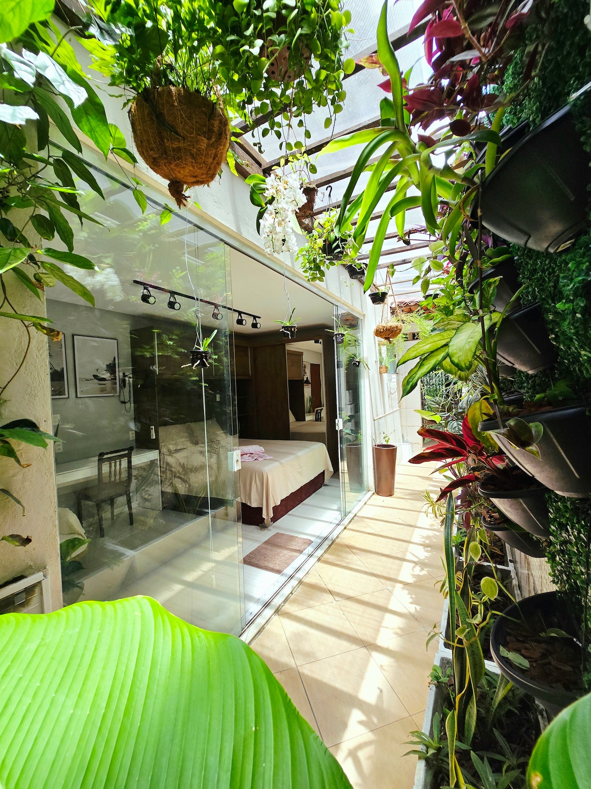Este lugar único tem um estilo próprio. Um retiro urbano tranquilo e sofisticado. O estúdio é bem iluminado, climatizado, decorado com lindos quadros e cortinas, cama de qualidade e conexão Wi-Fi. O jardim privativo é o destaque: estique a rede de casal e sinta a conexão com a natureza e as diversas plantas e flores. A cozinha é coberta e exclusiva para você. Além de tudo, você estará próximo ao mar, podendo ir a pé para a praia, restaurantes, academia e shopping.em um estilo próprio.