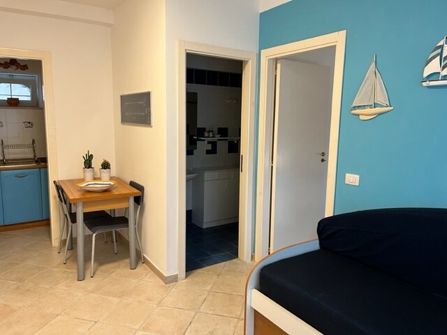 La nostra casa di famiglia di origine. L'appartamento è caratterizzato dalle belle cementine originali: è luminoso, fresco, ventilato, ben arredato e accessoriato. Comodo e tranquillo, con ampio e fruibile balcone a di 5 mq, vista e posizione esclusiva ed incantevole. Pratico parcheggio esterno, non custodito ma sicuro (caserme Loc.Pol/Carab), a 100 mt. Il cuore del paese con negozi, markets, bar e ristoranti è raggiungibile a piedi in meno di 5' e le spiagge, in auto, in 15'.