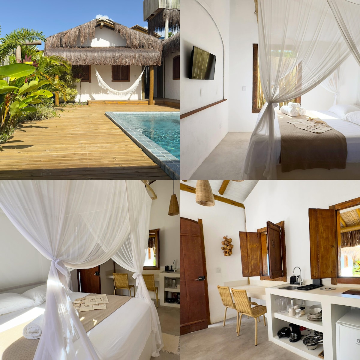 Bungalow independiente, cama matrimonial tamaño queen o 02 camas individuales, aire acondicionado, baño moderno, televisor inteligente con Netflix disponible, fibra óptica WIFI, pequeña cocina totalmente equipada, balcón con hamaca, 30 MT de las tiendas y 50 MT de Praia do Mucugê. Casa de campo, independiente, tamaño queen o cama individual doble, aire acondicionado, TV inteligente de baño moderno, fibra óptica WIFI, cocina pequeña, terraza de hamaca, a 30 metros del centro de Arraial y a 50 metros de la playa Mucugê