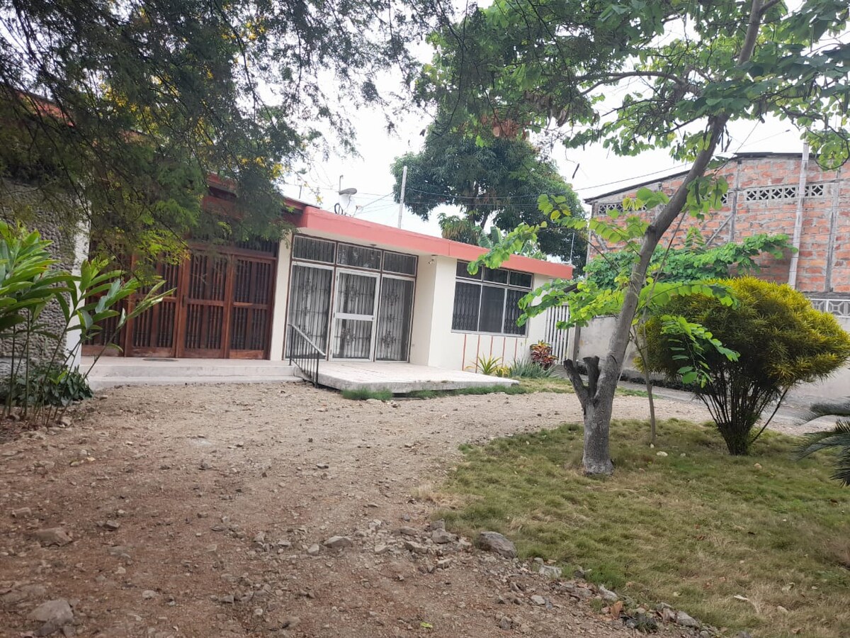 Relájate con tu familia o amigos en nuestra hermosa casa ubicada en un conjunto privado. La casa está completamente equipada con todas las comodidades necesarias para una estadía sin preocupaciones.Disfruta de la psicina que está ubicada justo al frente de la casa, así como de las áreas infantiles. Puedes realizar un asado cómodamente en nuestro patio. Contamos con un pequeño Gym si deseas ejercitarte. La casa esta a 3 min de SOLCA y 15 min de Crucita por si deseas visitar nuestra bella playa.