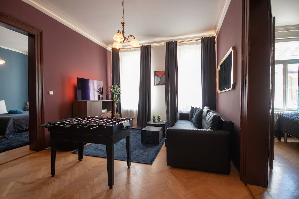 ¡Pasa tu escapada a Praga en nuestra nueva casa Doja Mojo Casa con decoración de Barbie! Nuestro apartamento céntrico está perfectamente equipado para hasta 7 huéspedes. El país de las maravillas de 2 dormitorios y 2 baños es como sacado de un sueño. Disfruta de tu propia sauna, bebe limonada rosa en el balcón, prepara fabulosos festines en la cocina totalmente equipada y disfruta de una acogedora chimenea. ¿Noche de cine? ¡Por supuesto! Tanto si viajas por negocios como por placer, ¡nuestro apartamento de Barbie y Ken es la base ideal para tu estancia!