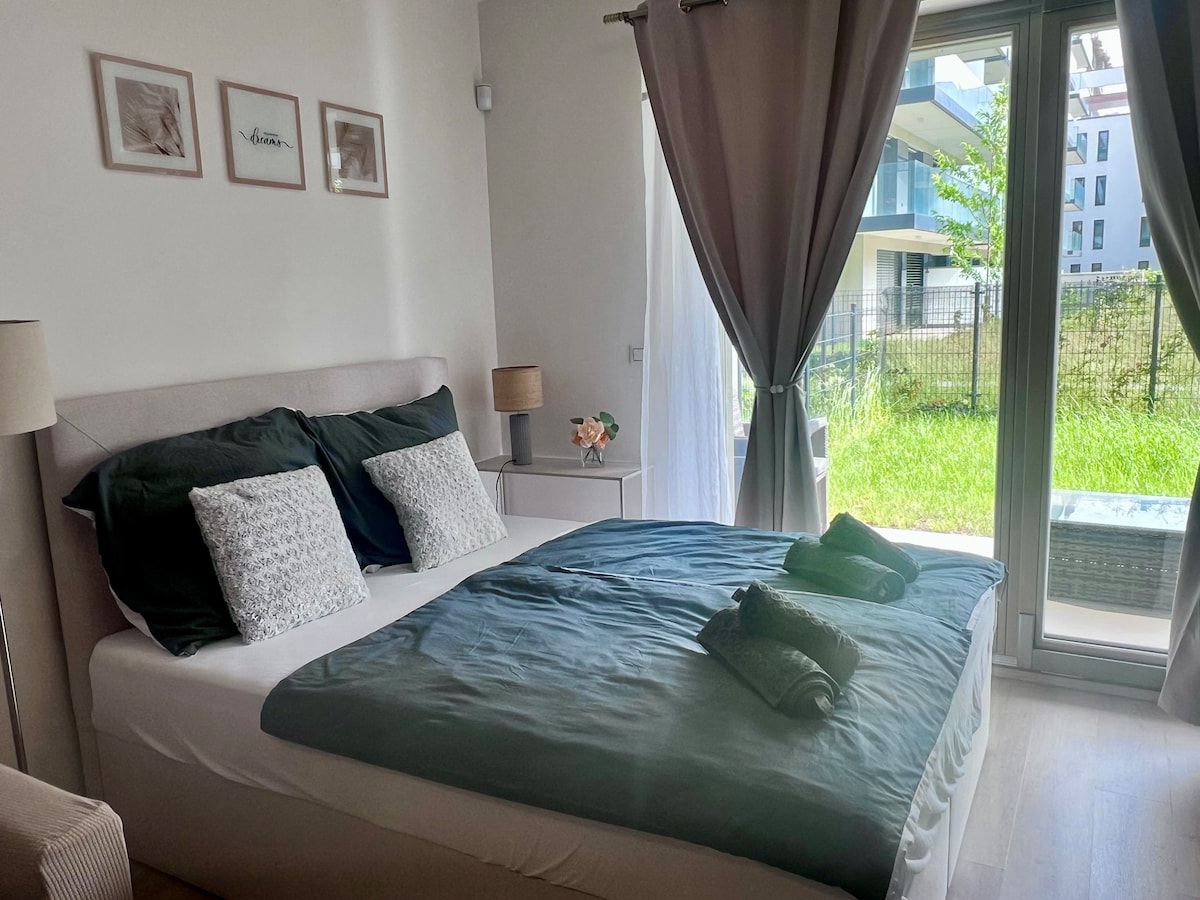 Nový moderní apartment, nacházející se v klidné častí Prahy v bezprostřední blízkosti parku a zároveň vzdálený jen 15 minut od centra Prahy. Je vhodný pro 2 osoby vyhledávající ruch velkoměsta a zároveň si po namáhavém dni chtějí nerušeně užít příjemný večer s posezením na soukromé terase 30m2, pod pergolou ve vlastní vířivce s celoročně vyhřívanou vodou či relaxovat v prostorné privátní sauně. Ke zpříjemnění romantiky stačí jen zapnout elektrický krb. Parkování zdarma. ve společné garáži.