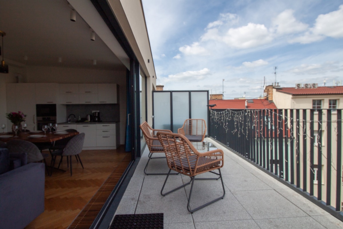 * TOP LOCATION in the center of Prague * PRIVATE TERRACE with amazing view * TWO-STORY SUNNY attic apartment with large windows * NEWLY BUILT and furnished in 2022 * PARKING available by the house * TRAM STOP right at the house * A/C * LIFT Experience unforgettable moments with friends or relax on the private terrace with a panoramic view of historical Prague and the most iconic sights of the Royal City of Prague.. The apartment is surrounded by bars, cafés, restaurants, and grocery stores.