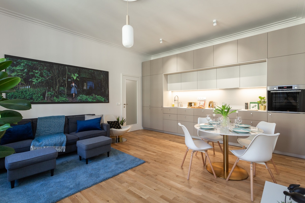 This charming, tastefully renovated three-room apartment (kitchen/diner, sitting room, and bedroom) is in an Art Nouveau building in Vinohrady (Vineyards), one of Prague’s finest and most prestigious neighbourhoods. Unfortunately, the property isn’t suitable for infants or children under 15. If a child is over 15, they’re a fully paid guest, allowing only one extra adult guest.