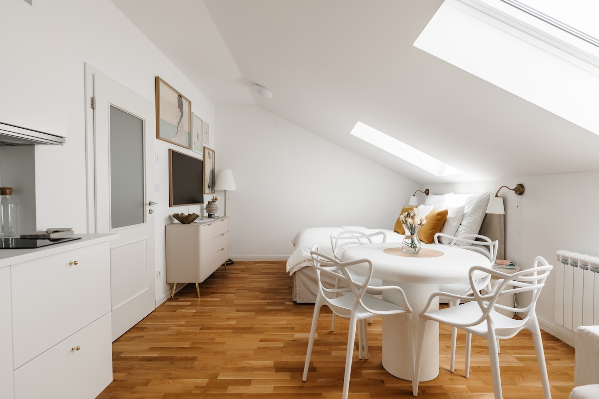 Una joya única en Praga: la favorita de los huéspedes en Airbnb. Disponibilidad limitada; suele estar reservado. * Encantador escondite en Praga * Loft reformado con ubicación céntrica a pie * Ideal para parejas, personas que viajan solas o para viajes de trabajo * Wifi de alta velocidad y Smart TV con Netflix * Cocina totalmente equipada. * Se proporcionan sábanas, toallas y artículos de aseo. * Las escaleras de caracol conducen a un dormitorio de ensueño con cama tamaño king. * Baño con ducha a ras de suelo. * Aire acondicionado y ventiladores * Línea de metro A (línea verde) Namesti Miru: 2 minutos a pie