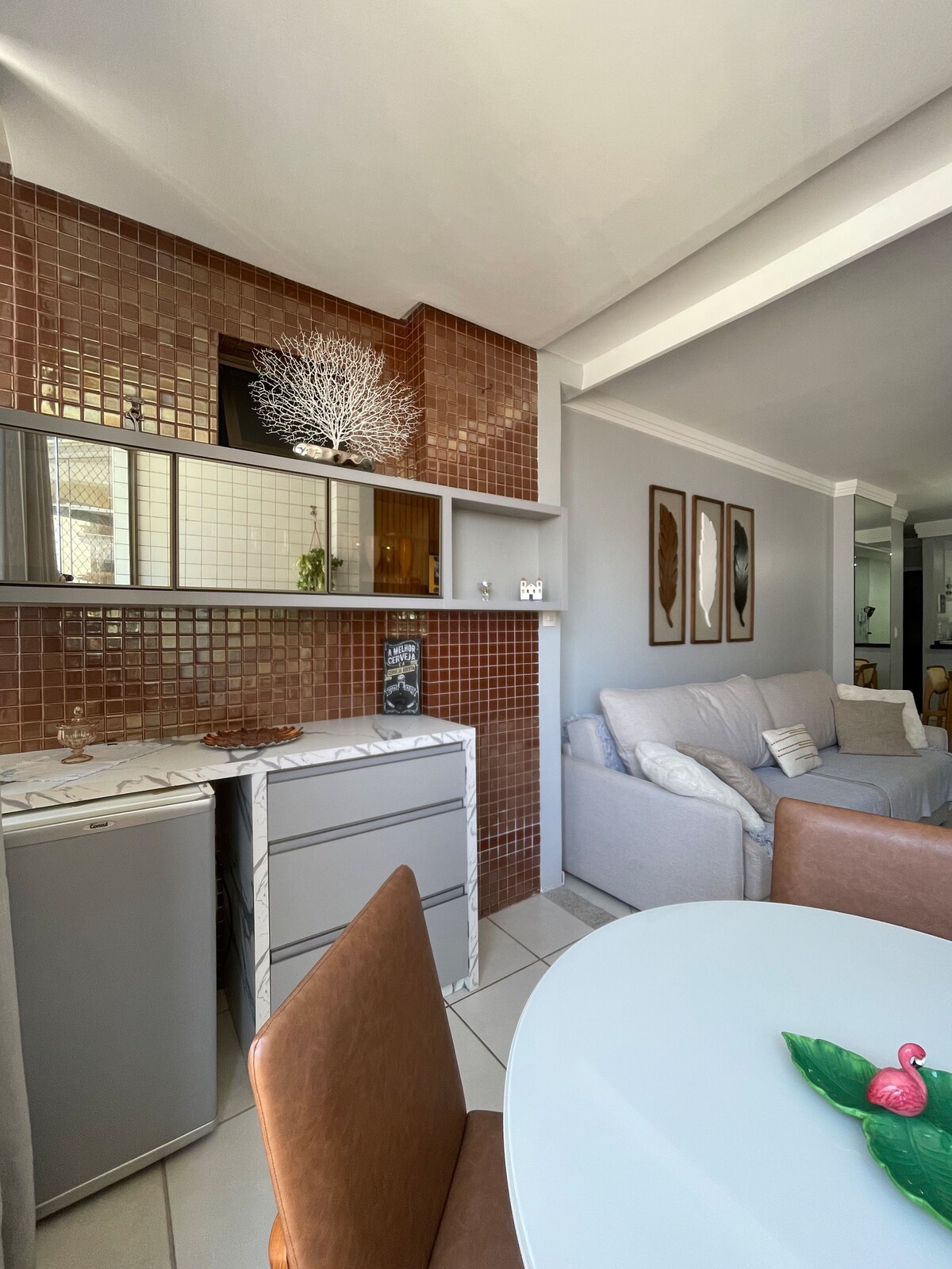Amplio departamento frente a la moderna playa de Peracanga, con una decoración única y elegante. Edificio nuevo, seguro y bien ubicado en la calle principal de Enseada Azul, cerca de todo lo que necesitas. Tres playas paradisíacas (Guaibura, Peracanga y Bacutia) están tan cerca que ni siquiera tendrás que sacar tu auto del garaje: ¡ubicación privilegiada! Las habitaciones están totalmente equipadas para tu comodidad, con wifi en todas las habitaciones.