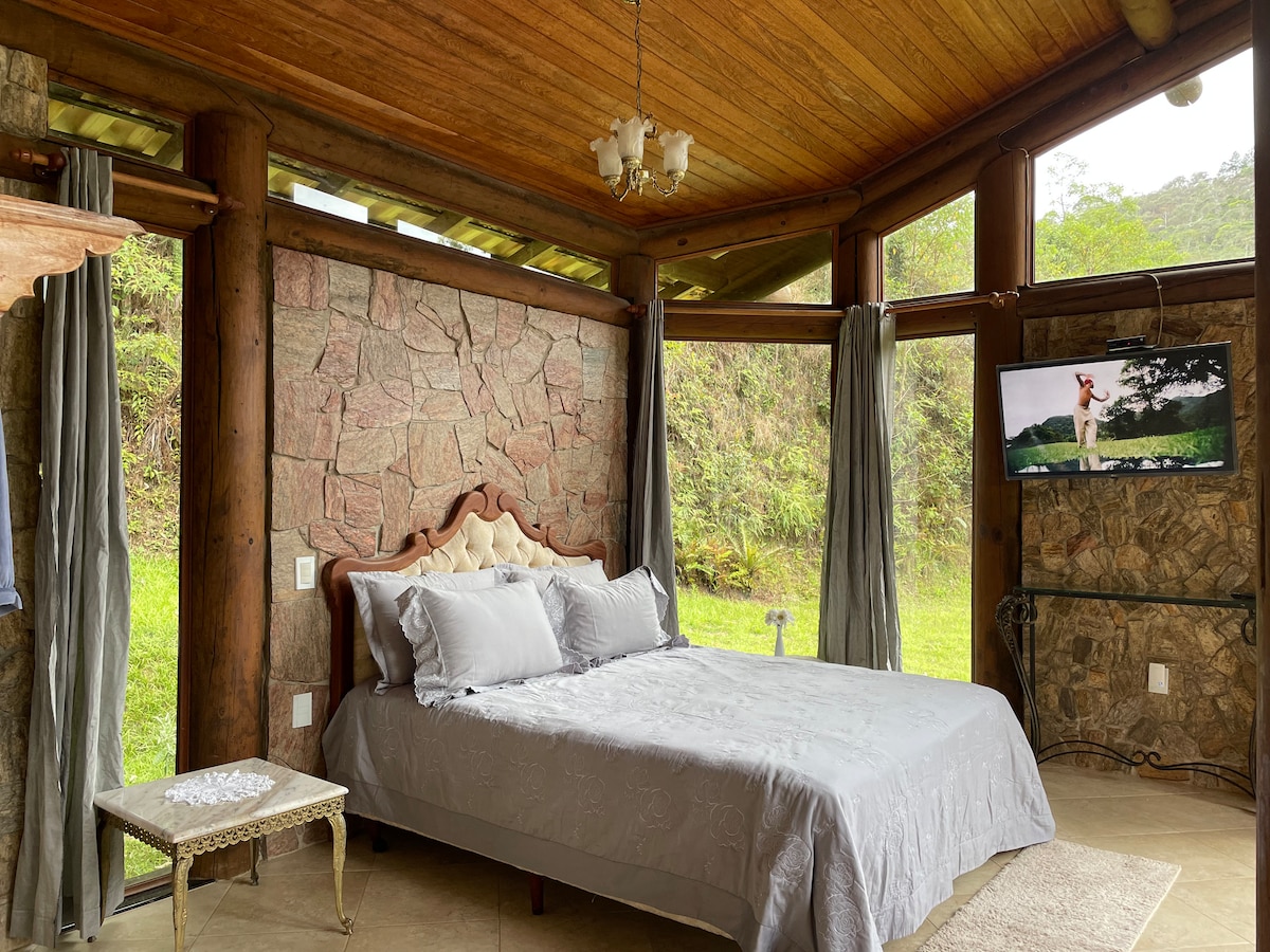 ¡Nuestro Bangalo tiene dos suites, una suite principal con cama king size, colchón Emma y bañera de hidromasaje! Nuestra segunda suite tiene una cama doble Nuestra casa tiene una cocina totalmente equipada, una mesa grande en la sala de estar, un sofá cama de 3 metros en la sala de estar y un televisor inteligente de 55 pulgadas con canales desbloqueados. En el exterior tienes una ecosauna. Nuestro espacio está totalmente equipado y listo para que vivas días extraordinarios, rodeado de naturaleza, puedes ir a las playas de Guarapari en 20 minutos y a la cascada en 5 minutos