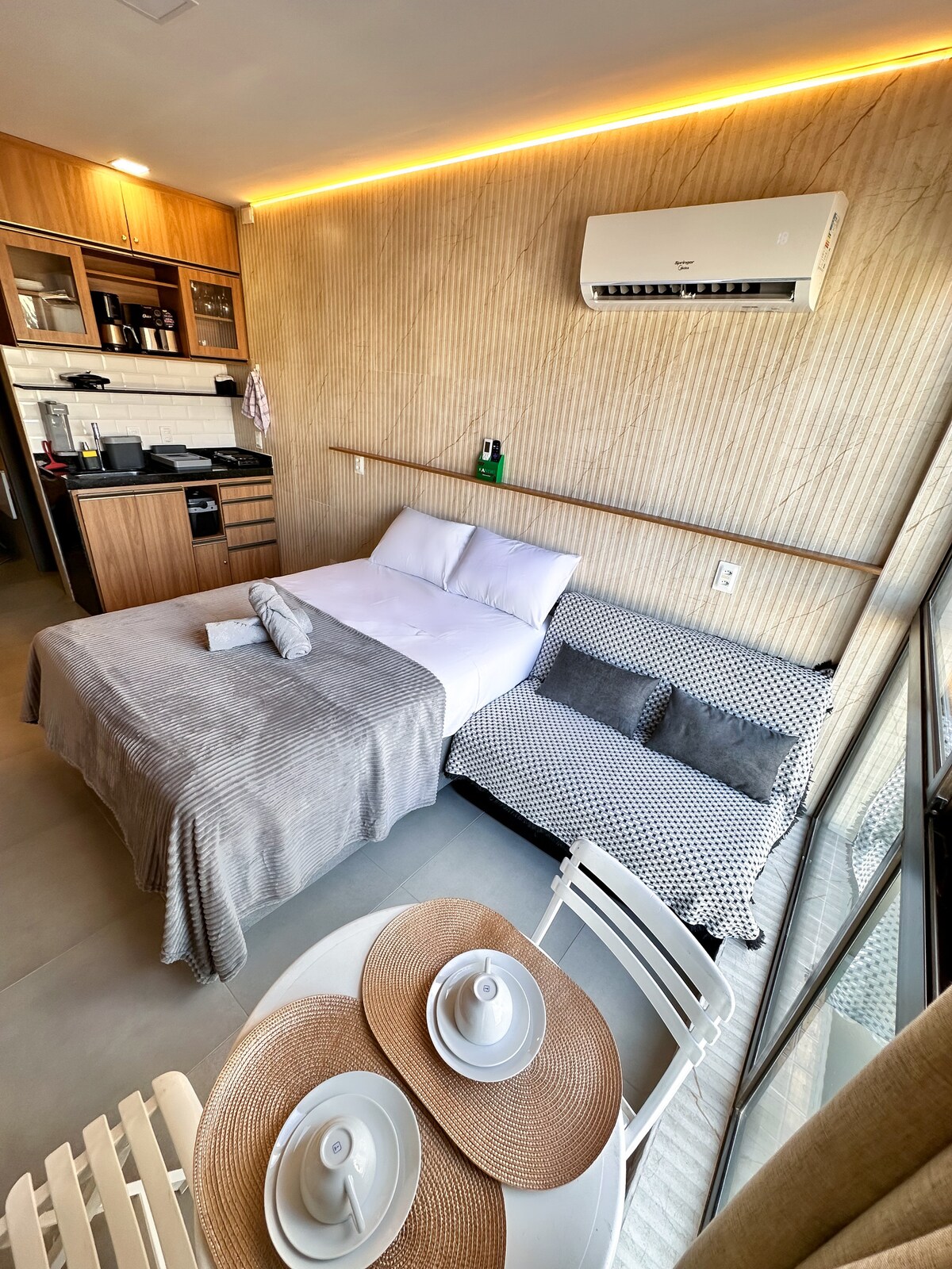 Acogedor apartamento, con cocina abierta, sala de estar con sofá cama, aire acondicionado, TV inteligente, balcón y un dormitorio con cama doble, aire acondicionado y armario. Cocina con todos los utensilios, microondas, licuadora, sandwichera, nevera, cafetera, vajilla y freidora de aire. Enxoval Ducha con calefacción de gas Wi-Fi Zona de ocio en la azotea con espejo de agua, vistas al mar, piscina para adultos y niños al atardecer Maraca Beach II está a 50 m de la playa, con ascensor, conserje 24 horas y acceso también por Beira Mar
