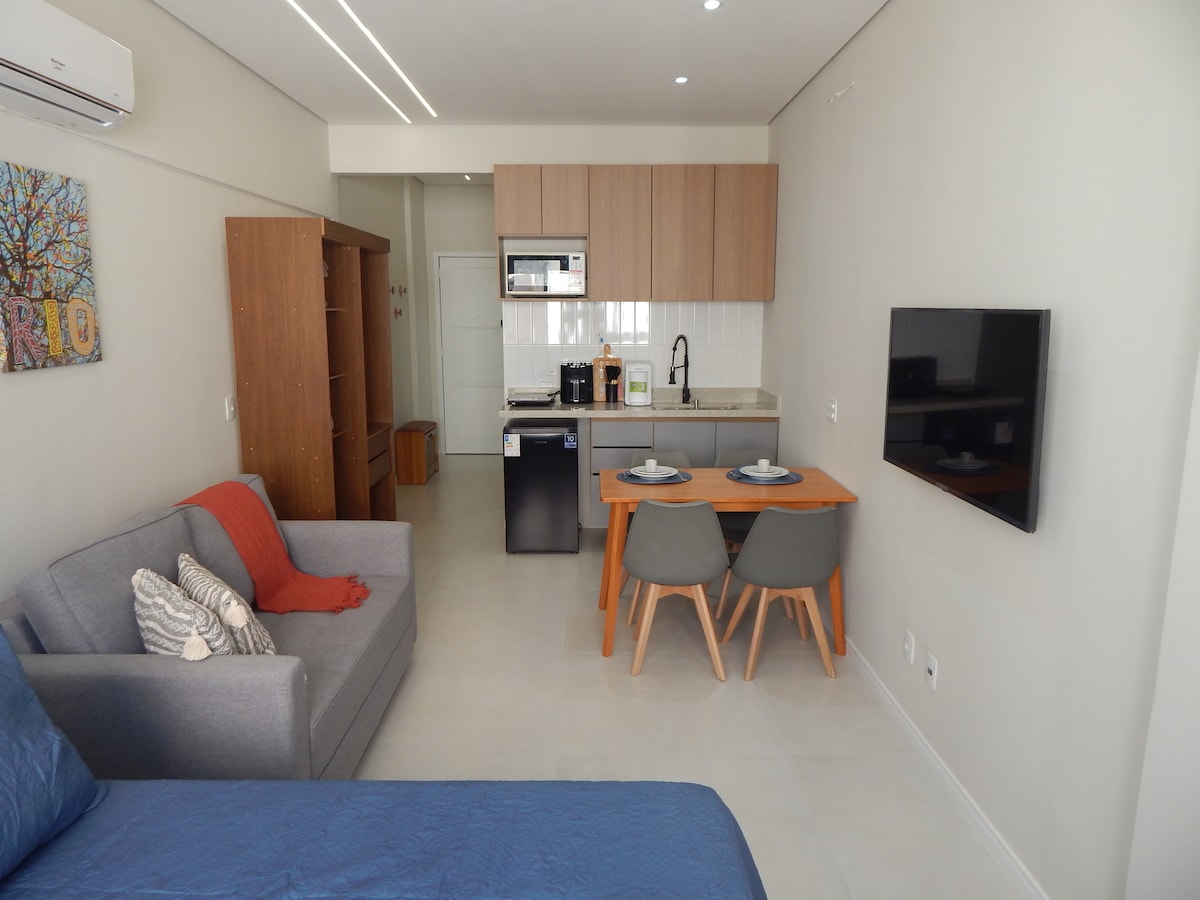 El departamento ofrece: • 1 dormitorio con una cama tamaño queen. • Aire acondicionado en el dormitorio y en la sala de estar - Wifi de 500 ! Televisión inteligente con Netflix, Globoplay y Amazon Prime • Mesa de comedor con dos sillas - Cocina completa (Nespresso, sándwich, minibar). • Baño (secador de pelo, artículos de tocador) • Plancha para ropa • Lavadora y secadora • Sala de estar con sofá • Ubicada en la calle del hotel Fasano.