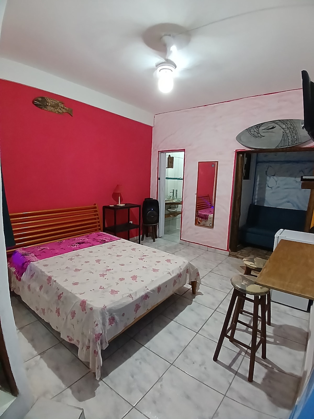 Encantadora y acogedora suite en la mejor ubicación de Ubatuba. A solo 200 metros del paseo marítimo de Itaguá y a pocos pasos de los mejores restaurantes, tiendas, mercados, el acuario, el Proyecto Tamar y otras atracciones. Equipado con una despensa con minibar, microondas, cafetera, sandwichera, utensilios y una mesa de comedor/trabajo. Tiene capacidad para 4 personas en una cómoda cama tamaño queen y una cama nido. También se incluyen wifi, TV inteligente, aparcamiento gratuito, tumbonas y sombrilla.