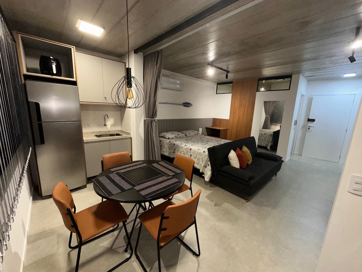 Un estudio de nueva construcción, con 41 metros de área, ubicado en la zona central de Ubatuba. Junto al centro comercial, de ocio y gastronomía de la ciudad. Cerca de la playa de Itaguá, donde se concentran varios restaurantes y bares de la ciudad. La casa tiene un dormitorio con una sala de estar, baño, balcón gourmet con cocina completa, con un espacio de estacionamiento cubierto. En la zona común del edificio, los huéspedes pueden tener acceso a la piscina y a la barbacoa(reservación/ tarifa) ubicada en la parte superior del edificio.