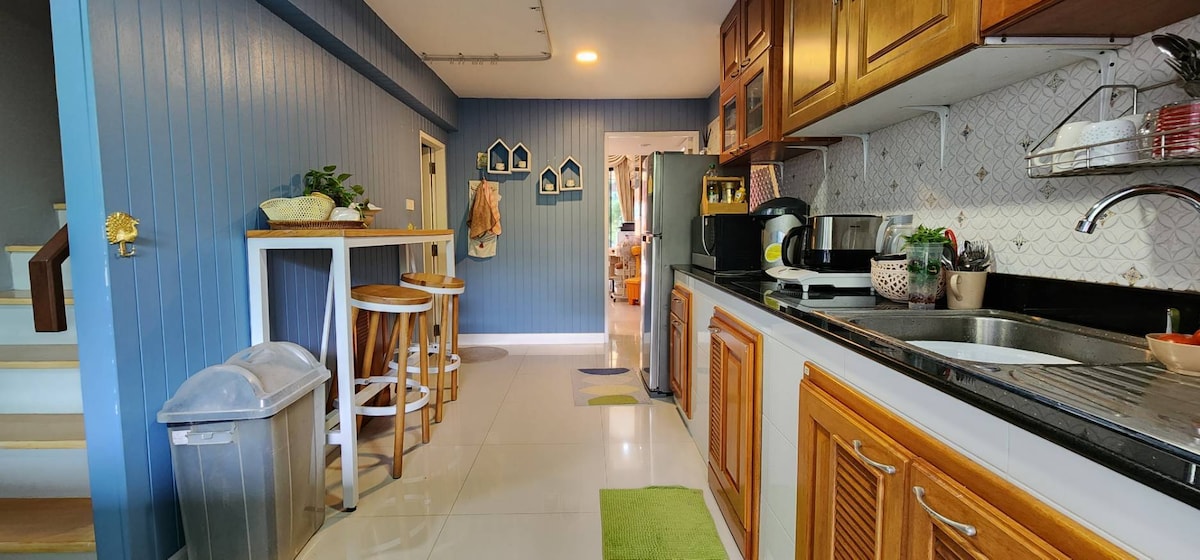 Una casa de 2 pisos en la ciudad de Buriram con servicios completos. Hay utensilios de cocina. Hay un gimnasio y una piscina en el área común. Hay un guardia de seguridad las 24 horas y cerca de lugares importantes como la Universidad Robinson y el estadio Chang.