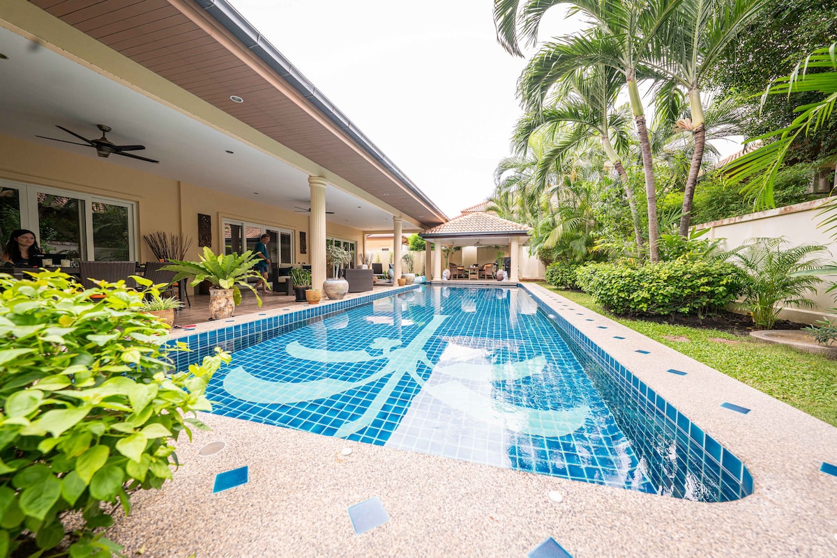 Ett hus med egen pool och känsla av Fjärran Östern - inbäddat i tropisk grönska. Ett trevligt välbevakat område. 2 Thailändska paviljonger - Salas. Mkt välutrustat kök. Arbets/träningsrum och bibliotek. Golfklubbor finns. Egna utgångar och dusch/WC till alla sovrum Nära till stränder, golfbanor och restauranger. 12 km till Hua Hins Centrum. Extra städning en gång/vecka ingår i priset Gjort som drömhus för oss och våra vänner - inte för uthyrning - kanske det är därför det blivit så uppskattat?