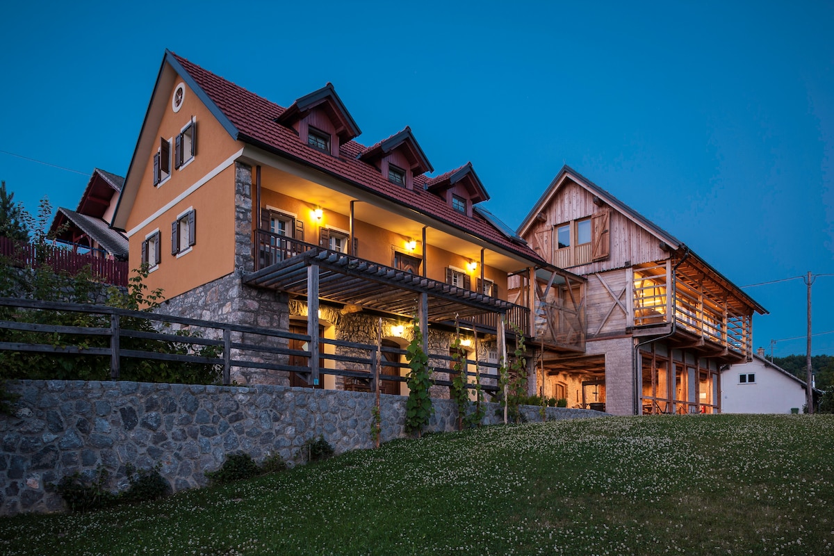 La casa de campo acogedora y cómoda ofrece una cocina moderna y bien equipada. En el jardín hay jacuzzi, sauna, chimenea y barbacoa, donde puedes preparar alimentos y disfrutar de las memorables puestas de sol. El encantador interior de la cabaña es una combinación de madera, vidrio y piedra. El retiro en la cabaña Sončni Grič abrazado por viñedos, bosques y aves enraizadoras te pondrá en contacto con la naturaleza y sus poderes curativos. El Sončni Grič se encuentra a solo un paso de la salida de la autopista Trebnje East.