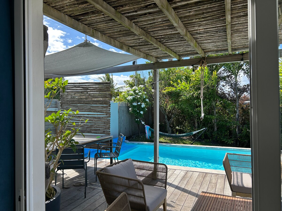 🏖️ 🌴Plages, restaurants, ☀️ sunset 🌅 et galerie commerçante à pied. Petite villa F2 qui dispose d'un spa-pool de nage 🏊 de 4m chauffé à 39° en hiver (avril à octobre) et laissé à température ambiante en été (novembre à mars) remplace la piscine. Idéal pour nager 🏊♀️ à contre courant. Une cuisine extérieure avec 🍖 barbecue, une douche extérieure eau chaude, un grand canapé, un lit Queen-size + un lit d'appoint sont sur place. Une Playstation 4 connectée. *Pas de beuveries ou de soirées*