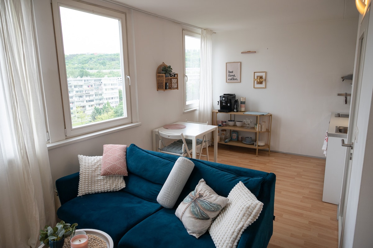 Discover the charm of modern living in our designer studio at the Hagibor complex! Enjoy the comfort of home with a fully equipped kitchen, Nespresso coffee maker, and relaxing book or Netflix evenings. With a balcony, garage parking, and fast internet, it's an oasis of calm in the bustling city. Just a short walk from Želivského metro station on the green line, you're moments away from the historic city center. The perfect place for your urban adventure!:-)