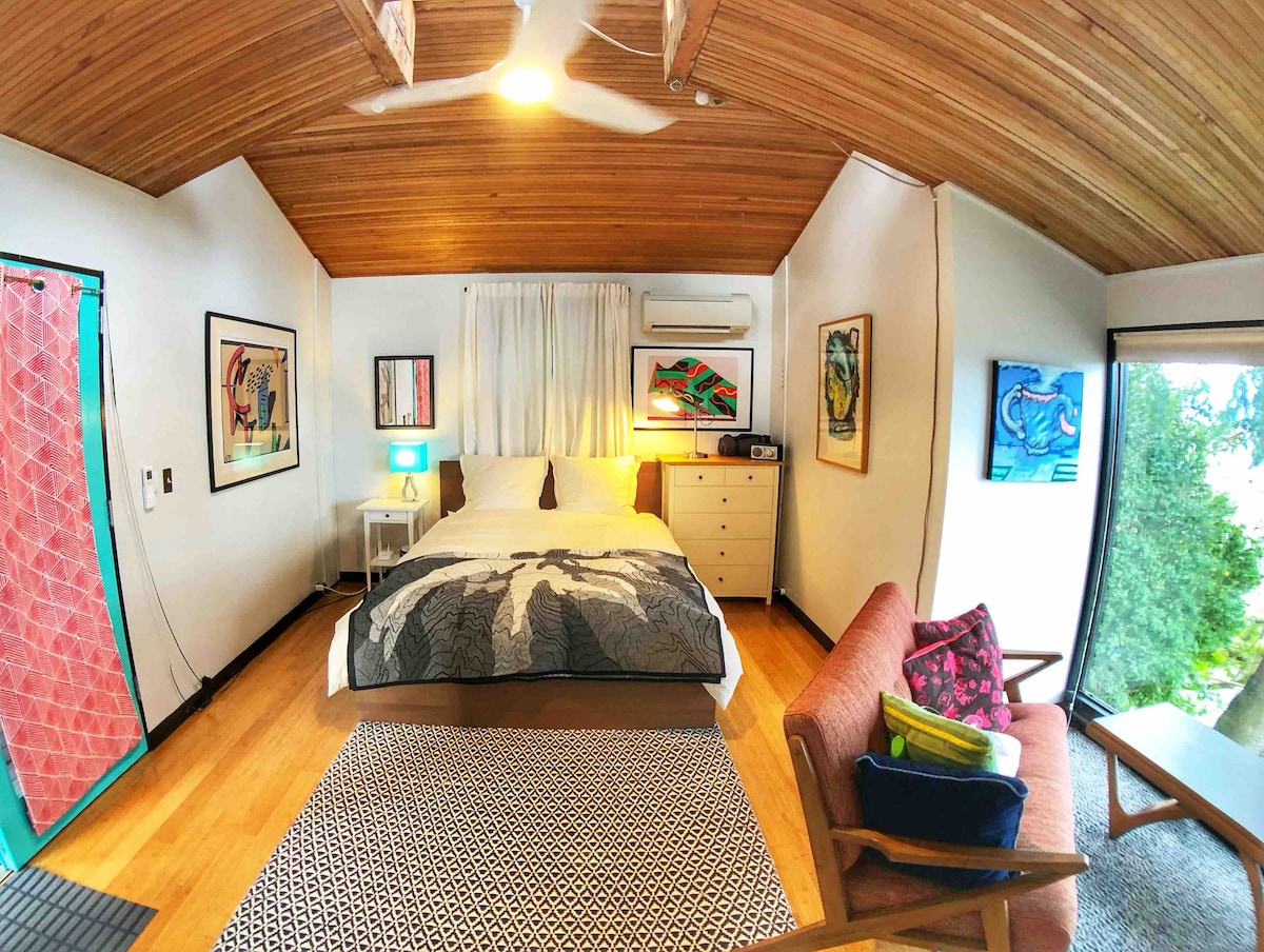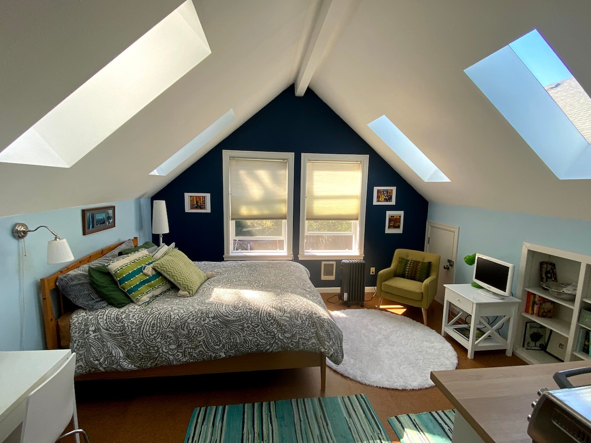 El barrio de Overlook es una de las joyas ocultas de Portland. Tranquilo, arbolado, pero a solo unos minutos de toda la acción que ofrece Portland. Camina o ve en bicicleta a restaurantes, cervecerías o tiendas en los distritos de Mississippi y Williams. Súbete a un tren (a tres manzanas) a todos los barrios. O, para relajarte, camina hasta los parques Overlook o Mocks Crest para disfrutar de unas vistas panorámicas del centro de Portland, Forest Park y el río Willamette. Sigue leyendo para ver si el techo más bajo del estudio es adecuado para ti.