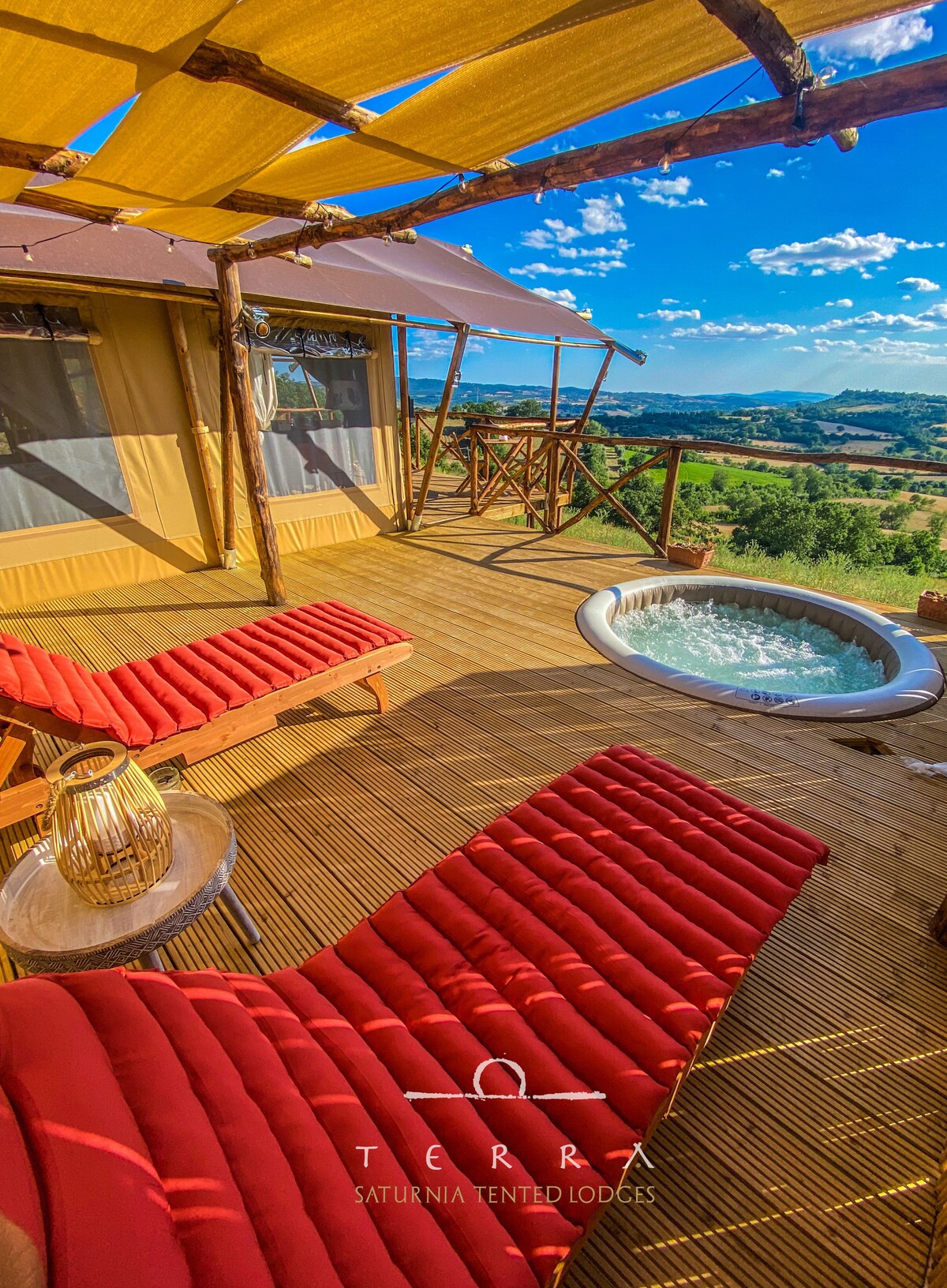 Terra es nuestro glamping con tres cortinas de lujo en una colina con vistas a Saturnia. A 2,8 km de la entrada a las Termas de Saturnia. En verano, podrás disfrutar de los platos que prepararemos con productos frescos del día. Todas las tiendas están equipadas con aire acondicionado, wifi, ventilador, minibar, hervidor y cafetera. Te despertará el aroma del desayuno que te espera en la terraza de tu tienda. Cada tienda tiene un gran solárium con tumbonas y un cómodo jacuzzi.